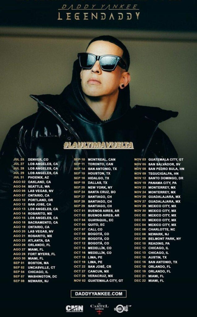 Por última vez, Daddy Yankee recorrerá el mundo con su gira de despedida “LA ÚLTIMA VUELTA”. Promovida por Cardenas Marketing Network y Raphy Pina, MR Sold Out, la gira de cinco meses incluye presentaciones en los lugares más prestigiosos en América del Norte y América Latina. De igual forma, realizará tres funciones en Puerto Rico los días 6,7 y 8 de enero de 2023.
